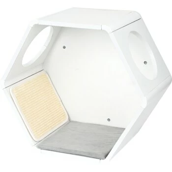 Inklusive Kissen für hohen Liegekomfort und Kratzteppich für die tägliche Krallenpflege. Die Anordnung der Elemente (Einstiegslöcher, Kissen und Kratzteppich) kann individuell angepasst werden, je nach persönlichem Geschmack oder den Bedürfnissen deiner Katzen.