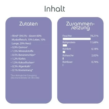 *Hierbei handelt es sich um Richtwerte. Die Zusammensetzung des Nassfutters: 94,50% Bio-Rind* (Muskelfleisch, Herz, Lunge, Leber) 1,50% Mineralstoffe 1,20% Kürbis* 0,90% Quinoa* 0,30% Algenkalk 0,10% Knotentang*