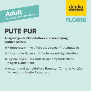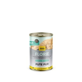 Frisches, zartes und leichtverdauliches Putenfleisch: Das ist FLORIE Adult Pute pur! Mit dem schmackhaften Geflügelfleisch als einzige Eiweißquelle eignet sich das Futter bestens für sensible Katzen. Auch Samtpfoten mit Futterunverträglichkeiten oder empfindlichem Magen-Darm-Trakt vertragen das Nassfutter.