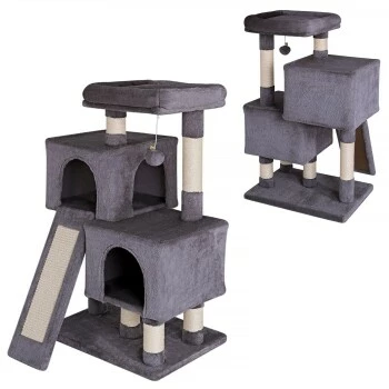 - MAßE UND FARBEN. Dieses hochwertige Katzenzubehör verfügt über die Maße 55 x 40 x 90 cm, die Höhlen über 35 x 35 x 25 cm und das Plateau 35 x 35 cm. Das langlebige Katzenspielzeug ist in den Farben Hellgrau und Dunkelgrau erhältlich.