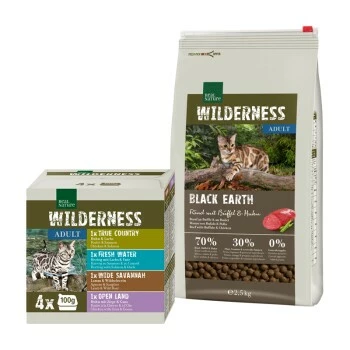 Das leckere Premium Mixpaket besteht außerdem aus der REAL NATURE WILDERNESS Nassnahrung. REAL NATURE WILDERNESS Nassnahrung bietet Ihrer Katze eine an der Ernährung der Vorfahren, der Wildkatze, orientierte, natürliche und getreidefreie Nassnahrung mit hohem Fleischanteil und sorgen für mehr Abwechslung im Napf.