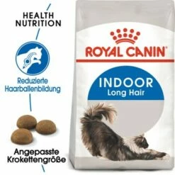 Die Katzennahrung ROYAL CANIN Indoor Long Hair wurde speziell auf die besonderen Bedürfnisse von Wohnungskatzen mit langem Fell abgestimmt. Das Trockenfutter stimuliert auf natürliche Weise die Darmtätigkeit und fördert dank ausgesuchter Fasern (inkl. Psyllium) eine gute Verdauung. Die Katze wird so dabei unterstützt, Haare, die sie bei der Fellpflege verschluckt hat, auszuscheiden. So wird der Bildung von Haarballen vorgebeugt.